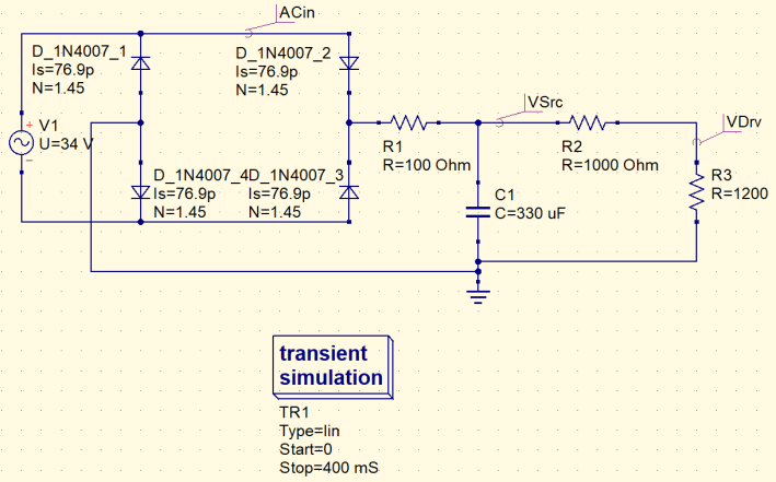 The base circuit can be seen on the initial schematic picture. It uses a full wave bridge rectifier and filtering resistors and capacitor components. I then ran the circuit through a Spice Simulator and determined we were good to go. The output was R3 which was the SSR for controlling the lamp.